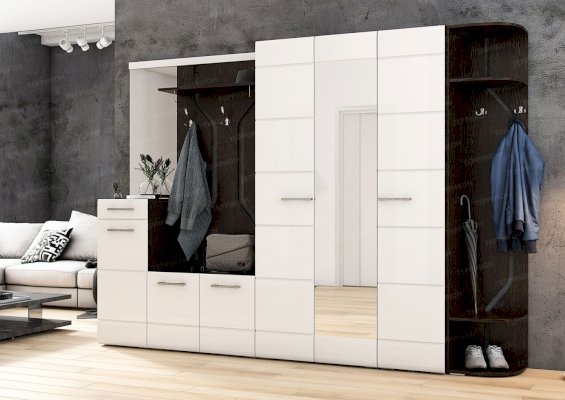 Изысканная простота прихожей «Фиеста» производит неизгладимое впечатление на поклонников современных стилей. Несмотря на незатейливость конструкции и отсутствие декоративных элементов, мебель смотрится ярко и нестандартно. Элитарный шик гарнитуру придают светлые глянцевые поверхности фасадов в сочетании с мягкими оттенками венге и ясеня шимо.