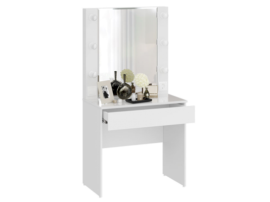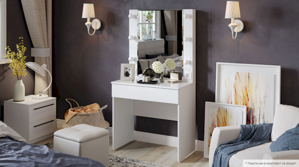Помимо внешней привлекательности, стол достаточно вместителен. Конструкцией предусмотрена просторная столешница со стеклом и практичный ящик под ней, где можно разместить все необходимые аксессуары и косметику. Стол имеет достаточно большое зеркало, а наличие подсветки обеспечит комфортный уход за собой, которая дает ровный и мягкий свет.