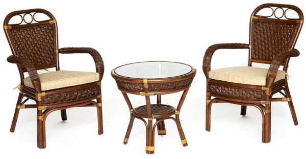 Изумительный террасный комплект мебели Secret De Maison из коллекции ANDREA, состоящий из столика и двух кресел, будет прекрасно смотреться в загородном доме, на дачной веранде, отлично подойдёт для отдыха на приусадебном участке. Уникальные плетеные узоры из натурального ротанга, выполненные вручную с использованием нескольких видов традиционного индонезийского плетения, добавят ноты изысканности и индивидуальности в ваш интерьер. Небольшой столик со столешницей из закаленного стекла, дополненный миниатюрной нижней полочкой, практичен и элегантен. Стекло обладает повышенной прочностью, долговечностью, способно многие годы не утрачивать своей первоначальной привлекательности. Два эргономичных кресла с мягкими подушками позволят удобно расположиться для комфортного отдыха. Тканевая обивка подушек проста в уходе, прослужит вам долгие годы, сохраняя свой первоначальный вид. Эта прочная и практичная мебель покрыта прозрачным матовым лаком, устойчивым к УФ-излучению, способна выдержать большие нагрузки, устойчива к повышенной влажности и долгие годы сохранит свой презентабельный вид. Комплект идеально сочетается с мебелью из коллекции ANDREA, поставляется в собранном виде.