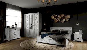 Распашной трехдверный шкаф выполнен в популярном стиле неоклассика – белые рамочные фасады с фактурой и рисунком натурального дерева, декоративные крестообразные накладки, фигурные ножки и карниз все это придает комнате элегантный и светлый вид. Вместительные отделения со штангой и полками поместит в себя верхнюю одежду, коробки с обувью и головные уборы. Мебель выполнена из экологичных материалов.