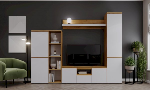 Крепится к стене через навесные элементы. Может использоваться индивидуально, а также может быть дополнительным элементом к тумбе ТВ.