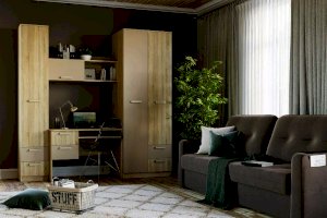 Отделение с 2-мя штангами позволит удобно развесить большое количество одежды на вешалках. Наличие полок позволит рассортировать одежду и поставить коробки. Два выдвижных ящика предназначены для сложенной одежды, аксессуаров, личных вещей.