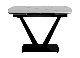 Лаконичный обеденный стол Клео с рисунком белого мрамора. Столешница из керамики отличный вариант для кухни. Материал знаменит прочностью и долговечностью, поверхность устойчива к различным внешним воздействиям. Компактный размер позволяет экономить пространство. Благодаря спрятанным по бокам элементам можно увеличить полезную площадь стола до 30 или 60 см. Металлический каркас черного цвета гармонично сочетается с цветом столешницы. Ножки V-формы надежно удерживают всю конструкцию. Основание каркаса оснащено заглушками, которые не позволяют металлическим частям соприкасаться с полом и портить покрытие при перемещении.