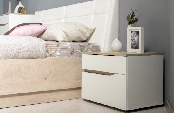 Это современное, практичное и уютное решение для спальни. Мягкое изголовье кровати установлено с небольшим наклоном, что даёт возможность не только лежать, но и комфортно сидеть, как на диване. Подъёмный механизм обеспечивает удобный доступ к вместительной системе хранения. Все изделия установлены на регулируемые опоры, что значительно упрощает установку и позволяет компенсировать неровности пола. Лицевую фурнитуру заменяет стильный вырез, за которым видно древесный декор корпуса. Вырезы делают внешний вид изделий асимметричным, что делает композицию современной и динамичной. Стеллаж и шкафы могут быть собраны в единую компоновку, давая возможность собрать в интерьере стильную шкафную группу. Наполнение шкафа может собрано на любую сторону, два выдвижных ящика скрыты за распашными фасадами, на обратной стороне которых размещается зеркало.
