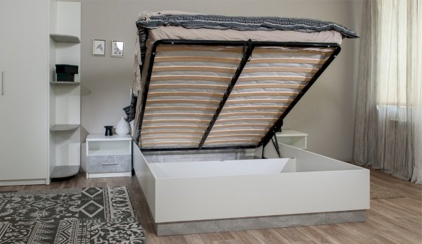 Кровать Аврора - акцент спальни, выполнена в стиле минимализм, удобна и просторна, можно с комфортом проводить свободное время. Изголовье - комбинированное, с декоративной вставкой контрастного цвета по центру. Кровать с надежным ортопедическим основанием с подъемным механизмом на газлифтах, внутри расположены две секции для хранения подушек, одеяла и любых других вещей.