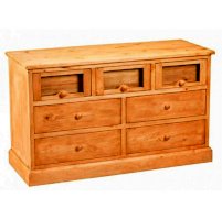 Широкий комод-тумба с основательным цоколем выполнен в стиле Прованс. Между фасадом ящика и стеклом можно вставить фотографии, насыпать крупу или сухоцветы. Этот комод будет удобен и для белья, и для кухонных принадлежностей.
