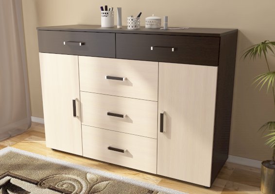Среди комодов линейки Вега модель К-03 самая функциональная. В ее конструкции предусмотрены 5 выдвижных ящиков и две закрытые ниши с полками, поэтому К-03 идеально подойдет для гардероба.