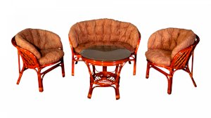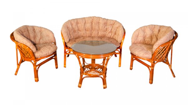 Комплект из натурального ротанга, состоящий из дивана, двух кресел и круглого столика со стеклом.