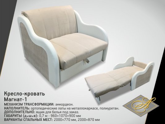 Кресло-аккордеон «Магнат-1» асм - за 40 029 руб. в Абакане. Купите на сайте mebelmarket-abakan.ru или по телефону 8(800)505-30-63 уже сегодня! Уточнить наличие, комплектацию, актуальную цену можно бесплатно у менеджера ежедневно. Закажите Кресло-аккордеон «Магнат-1» асм до конца акции! Доступна покупка в кредит, рассрочку. Доставим со склада или на заказ.