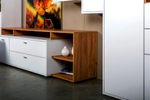 Фурнитура: Распашные двери на четырёхшарнирных петлях; выдвижные ящики - фолдинги на шариковых направляющих.