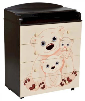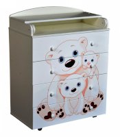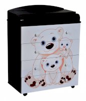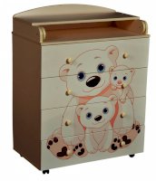 Пеленальный комод 800/4 Lilu 5 отличается привлекательным дизайном с использованием тематических детских принтов. В конструкции изделия предусмотрены 4 маленьких передвижных колеса, несколько вместительных ящичков на шариковых направляющих и откидывающаяся пеленальная столешница. Детский пеленальный комод, декорированный красочным рисунком, вмещает в себя постельные принадлежности, средства гигиены, распашонки, подгузники, игрушки, ползунки и другие личные вещи ребенка. Гладкая столешница идеально подходит для пеленания ребенка, а колесики позволяют быстро перемещать комод.