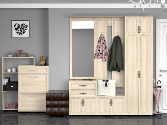 Удобный и многофункциональный модуль для прихожей, сочетающий в себе тумбу с 2-мя выдвижными ящиками и большое зеркало.